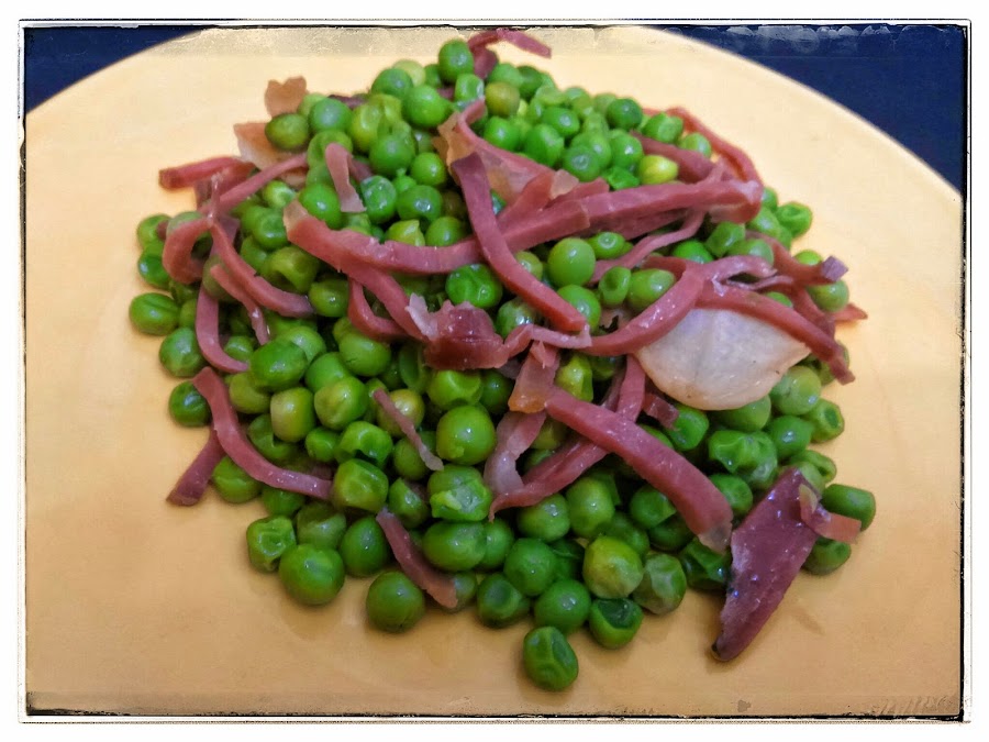 Una vez que tenemos los guisantes , ponemos una sartén al fuego con un chorrito de aceite de oliva y echamos los ajos previamente laminados dejando que doren , añadimos los guisantes y damos una vuelta con la espátula para que cojan el saborcito del ajo , por ultimo añadimos el jamón cortadito como mas nos guste y lo dejamos un par de
