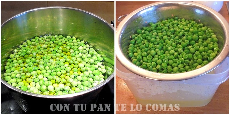 1. Hervimos los guisantes en agua (yo pongo sólo lo suficiente para cubrirlos) con una pizca de sal y un chorrito de aceite de oliva. El tiempo dependerá del grosor de los guisantes (sigue las recomendaciones que vienen en el paquete).