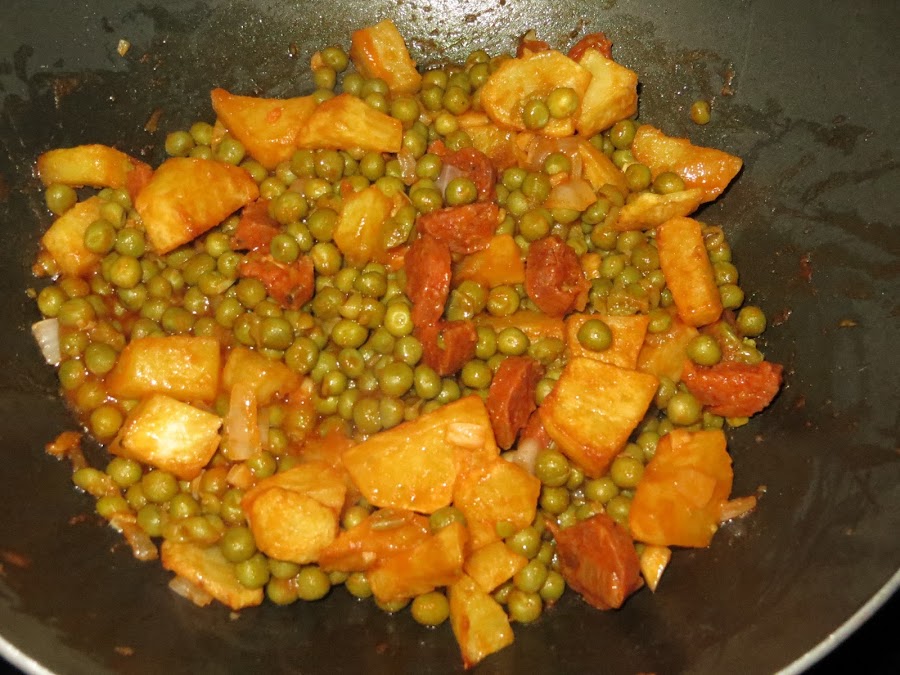 Ahora en un cacerola o sartén amplia, echáis un chorro generoso de aceite y comenzáis a freír el diente de ajo bien picado y la cebolla a fuego medio. Cuando veáis que la cebolla está transparente añadís el chorizo y le dais un par de vueltas. A continuación, echáis los guisantes para que cojan todo el sabor de la grasa que ha soltado el chorizo. Añadís las cuatro cucharadas de tomate frito y las patatas dais varias vueltas con una cuchara para que se mezclen todos los sabores y listo para servir.