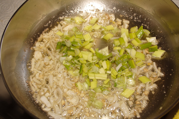 Picamos finamente la cebolleta, el ajo y reservamos. Hacemos lo mismo con la porreta.