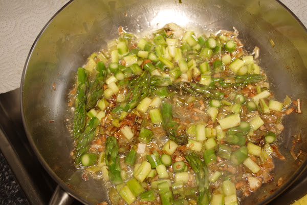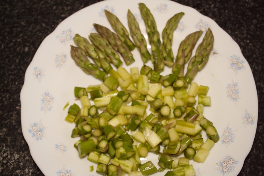 Limpiamos los espárragos, los troceamos menudos, excepto las yemas, que las dejamos enteras y reservamos.