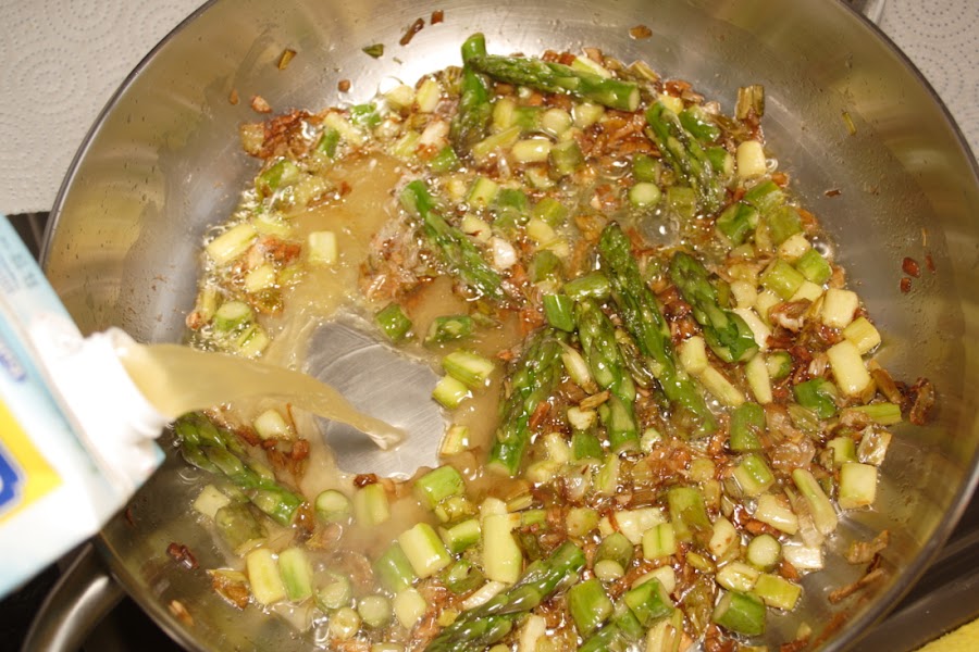 Seguidamente incorporamos los espárragos con las yemas enteras, removemos y dejamos hasta que estén blandos, echamos un chorro generoso de vino blanco y que se evapore el alcohol. Vertemos un chorro de caldo (que no los cubra, solo para que terminen de hacerse), removemos, sazonamos y si estan los espárragos blandos añadimos los guisantes.