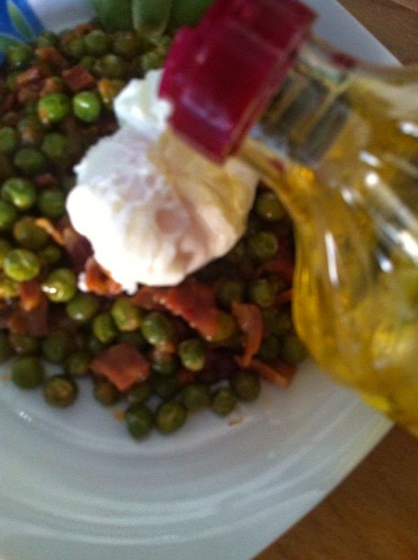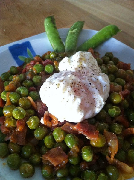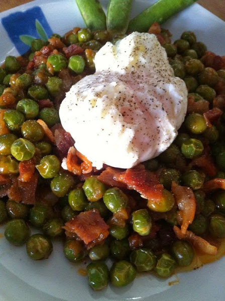 Ahora, solo nos queda emplatar. Simplemente poniendo en el fondo del plato unas cucharadas de guisantes, y un huevo escalfado encima, bañado con un pequeño chorro de aceite de oliva y un poco de pimienta negra molida, haremos de un plato sencillo, todo un manjar de estrella michelin.
