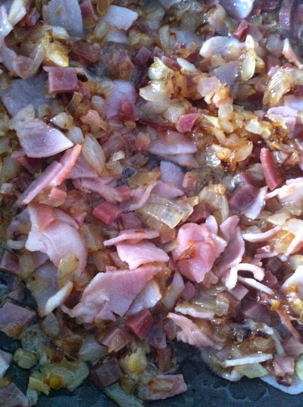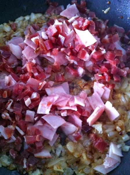 Cuando la cebolla este dorada y blandita, añadiremos el bacon y el jamón, y saltearemos a fuego medio durante unos 4 minutos.