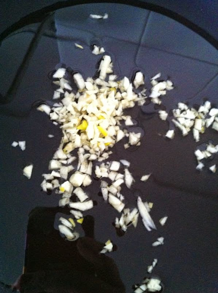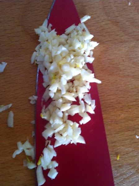 Mientras este se nos calienta, picaremos muy finitos los dos dientes de ajo, y añadiremos a la sartén.