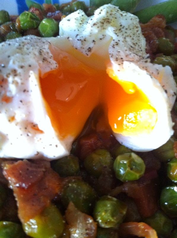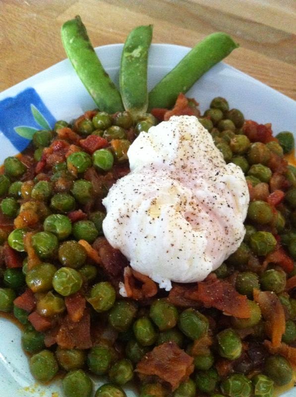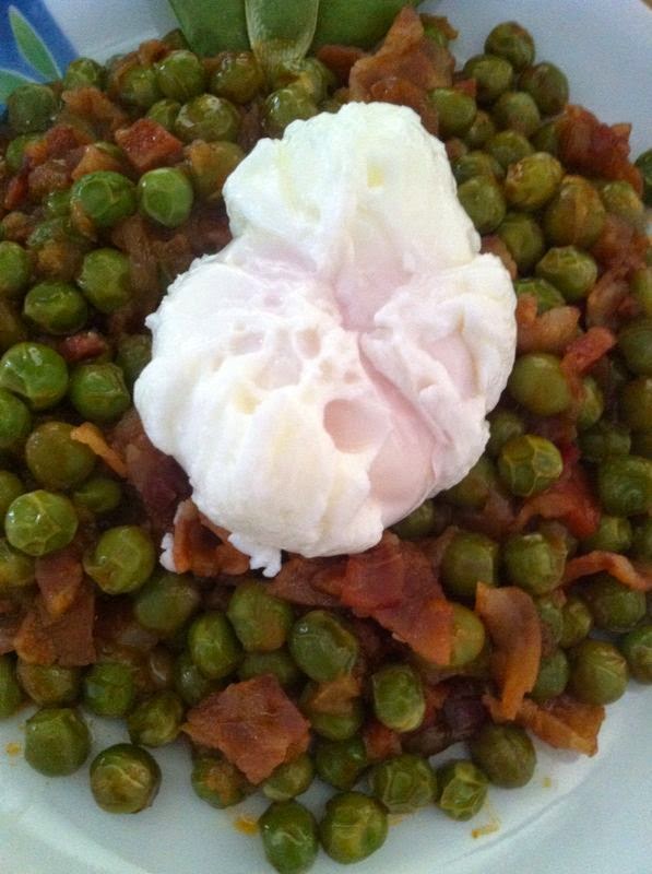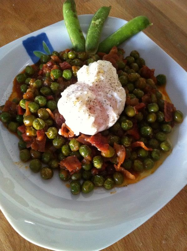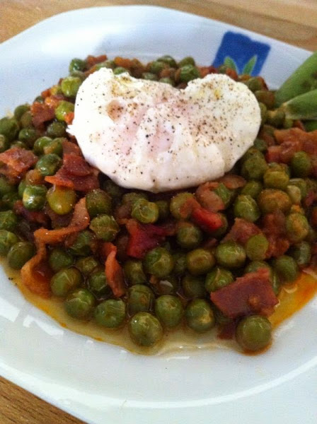 Cuando tengamos los huevos escalfados hechos y sin plástico, los guisantes deberán estar listos de sobra, así que solo nos quedara servir, habiendo previamente, probado el punto de sal de los guisantes, y rectificando la sal si es necesario añadir un poco mas.