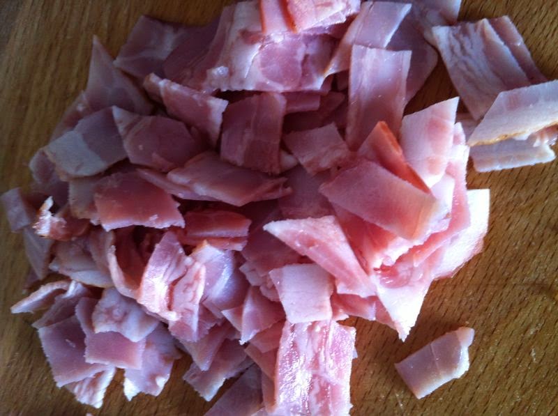 Mientras se nos hace la cebolla, picaremos el bacon y el jamón en pequeños trozos.