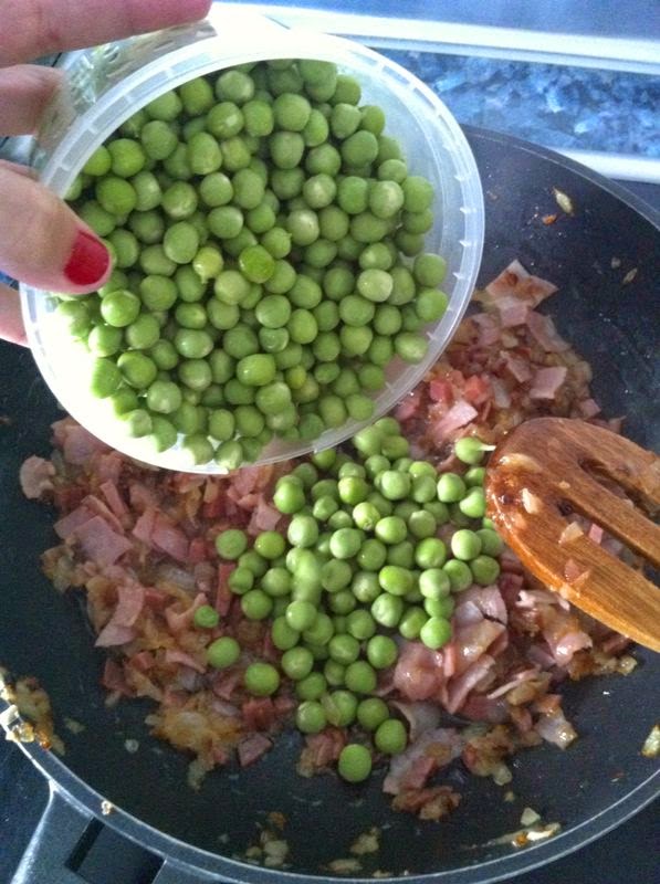 Seguidamente, añadiremos los guisantes y mezclaremos todo bien.