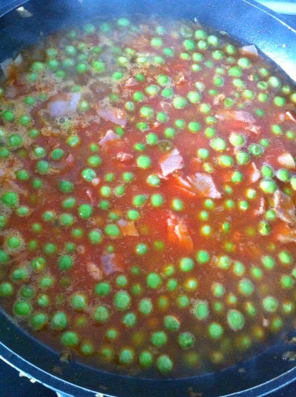 Mezclamos todo bien, y añadimos un vaso y medio de agua aproximadamente. Que justo cubra los guisantes. Ni mas ni menos.