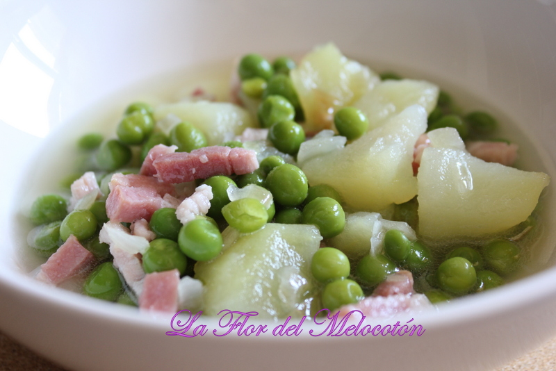 En una cacerola ponemos como tres dedos de agua y la llevamos a ebullición. Añadimos las patatas chascadas a trozos pequeños y a los 5 minutos echamos los guisantes y seguimos los consejos de preparación de la bolsa, más que nada los tiempos de cocción.