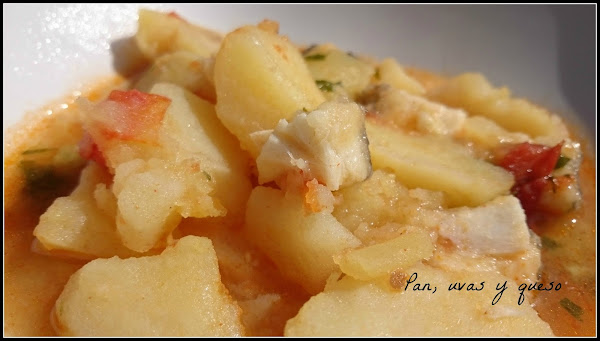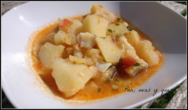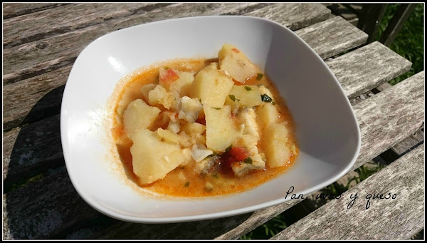 Echamos las patatas y un chorro de Brandy, removiendo bien todo. Cubrimos con agua y dejamos que rompa a hervir. En ese momento añadimos el bacalao troceado y bajamos el fuego dejando que se cocine hasta que las patatas estén tiernas.