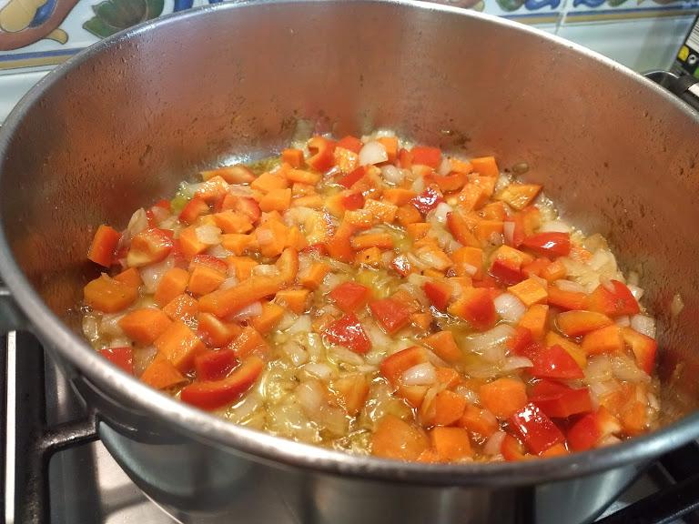 Pelad y trocead la zanahoria y la cebolla. Lavad y cortad el pimiento. Reservadlo