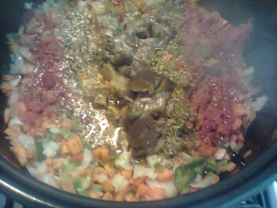 Le agregamos los condimentos: orégano, provenzal, albahaca, comino, pimentón, y 2 caldos de verdura en cubos (no le pongo sal)