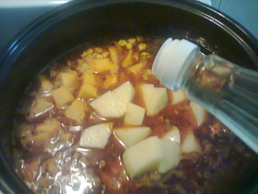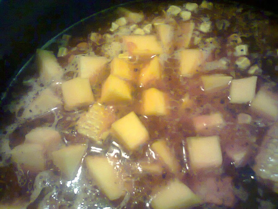 y una papa grande tambien cortada en cuadrados, aqui comoven en la foto le agrego un buen chorro de vinagre de manzana y eso hace que las papas no se deshagan al cocinar....