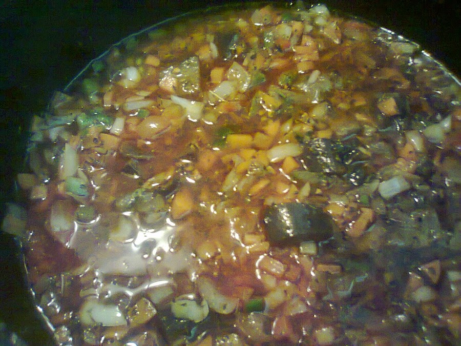 Comenzamos con 1 cebolla mediana, 1 zanahoria chica, 1/2 morrón verde y 1/2 rojo, todo esto picado en cuadraditos, aceite de girasol..cantidad necesaria para rehogar estos ingredientes como muestra la foto.....