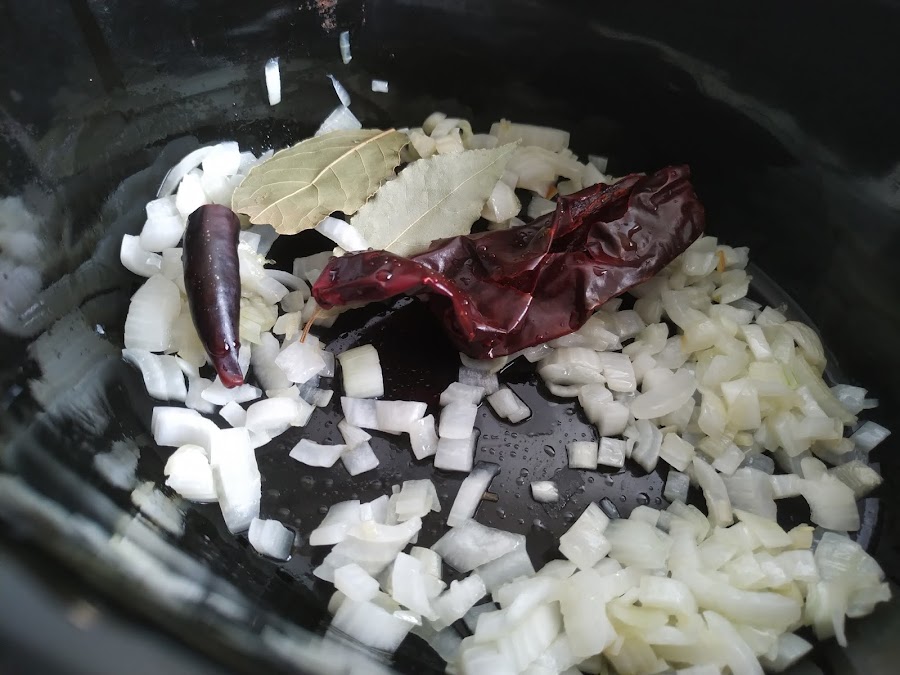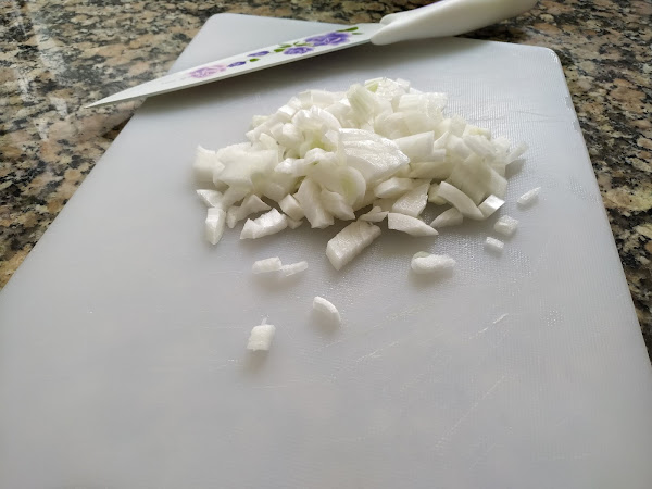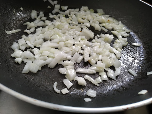 Cortamos en daditos muy pequeños la cebolla y los dientes de ajo, y lo salteamos ligeramente en una sartén con un poco de aceite de oliva.