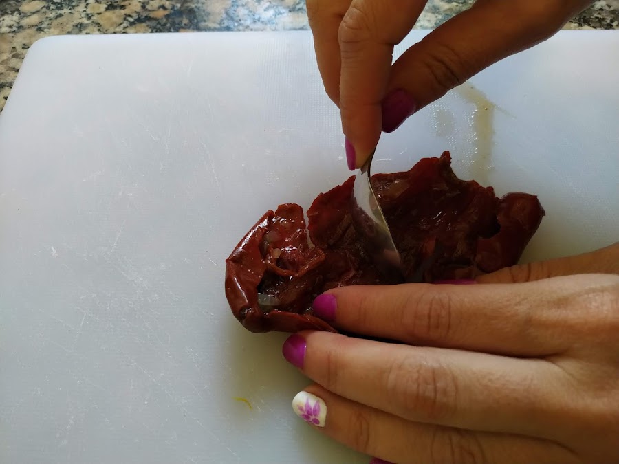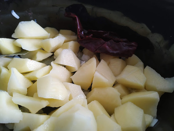 Una vez pasadas las 4 horas comprobamos que la patata esté bien cocinada, si ya está a nuestro gusto, sacamos el pimiento choricero, separamos la carne del pimiento y la volvemos a añadir a la olla, desechando la piel. Retiramos también la punta de guindilla.