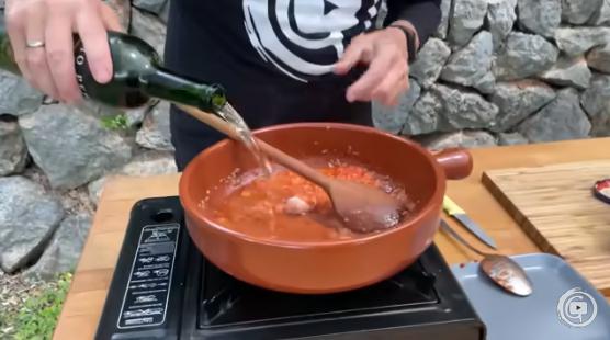 Echa el Vino Blanco y deja reducir el alcohol a la mitad (unos 2 minutos). Si se te seca la garganta un poco ponte una buena copita de Vino Blanco para hidratarte bien.