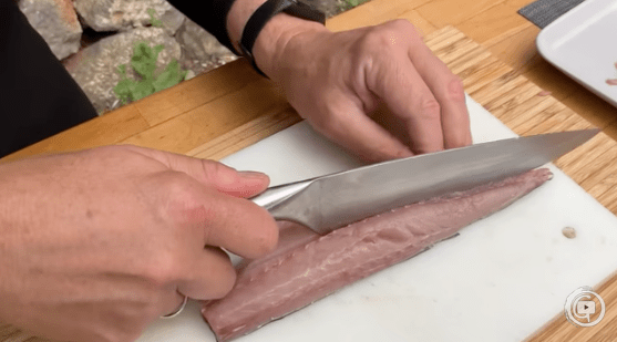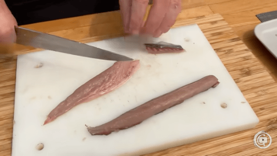 Quita la Espina central a los Filetes de Caballa usando el cuchillo por ambos lados de la Espina y dejándola sola en el centro.