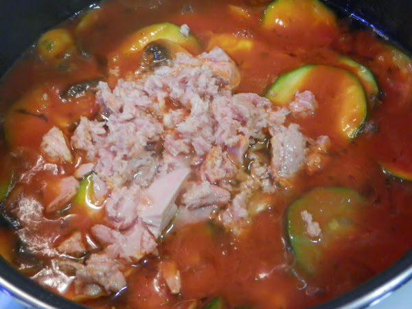 Cuando lo tengamos prácticamente hecho, añadimos el atún y rehogamos.