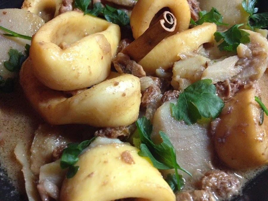 4.- Añadimos las papas al guiso, con las pasas escurridas, las nueces, la hoja de laurel, la nuez moscada y la canela. Salpimentamos, cubrimos ligeramente con un vaso de agua. Tapamos, dejamos que se cocine unos 15 minutos más a fuego suave. Y la vez este el guiso preparado, servimos decorando con una rama de canela y perejil picado por encima.