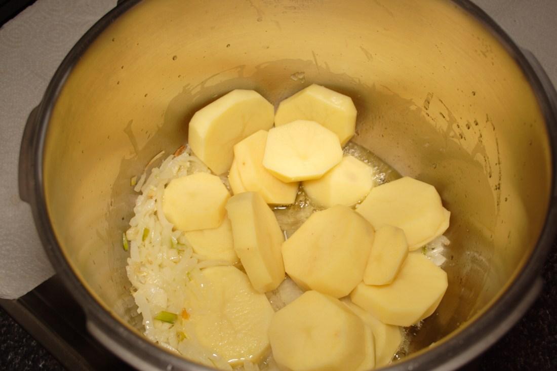 En una olla rápida vertemos un chorro de aceite de oliva, ponemos al fuego y doramos los ajos y la cebolla.