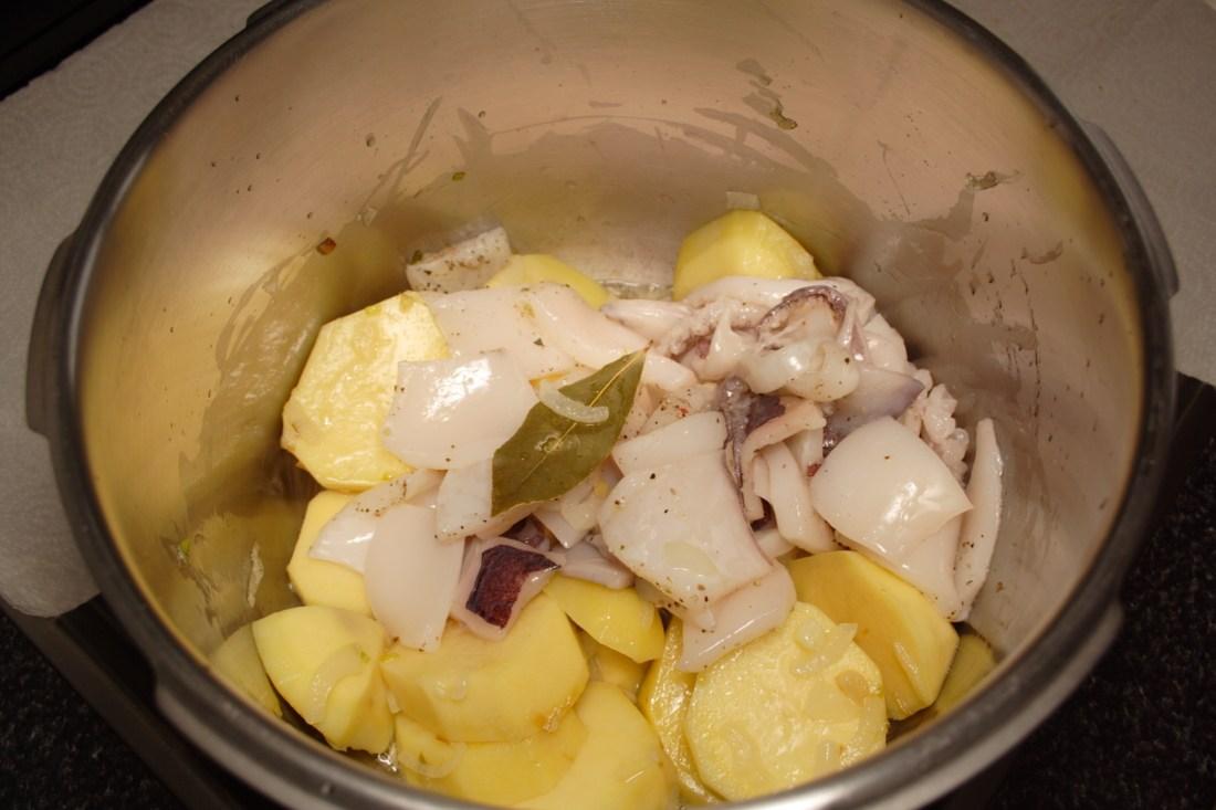 Incorporamos los calamares troceados, subimos un poco el fuego echamos la hoja de laurel y el brandy.