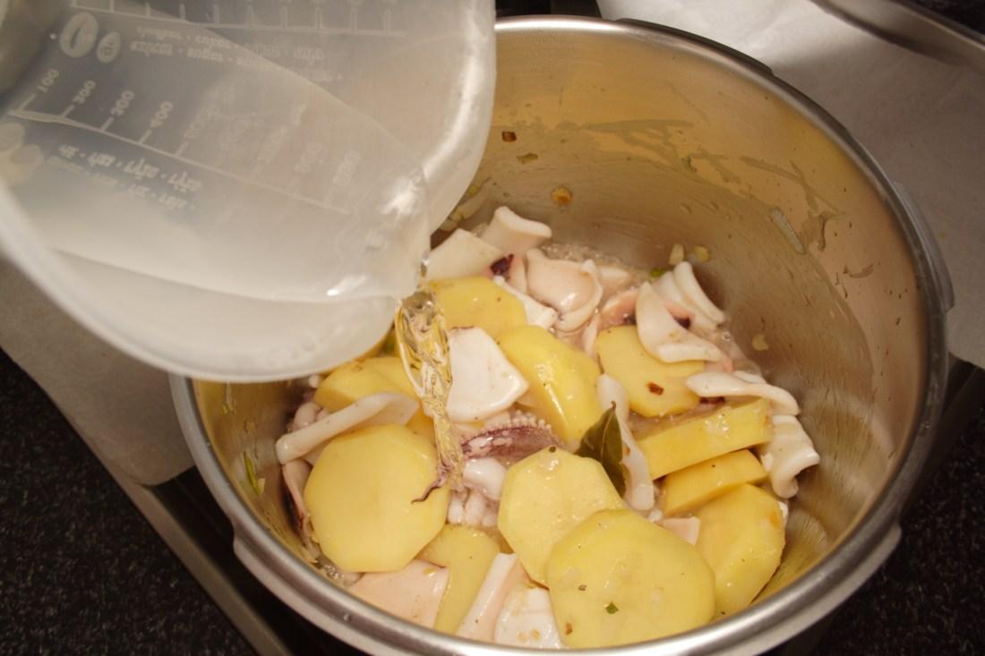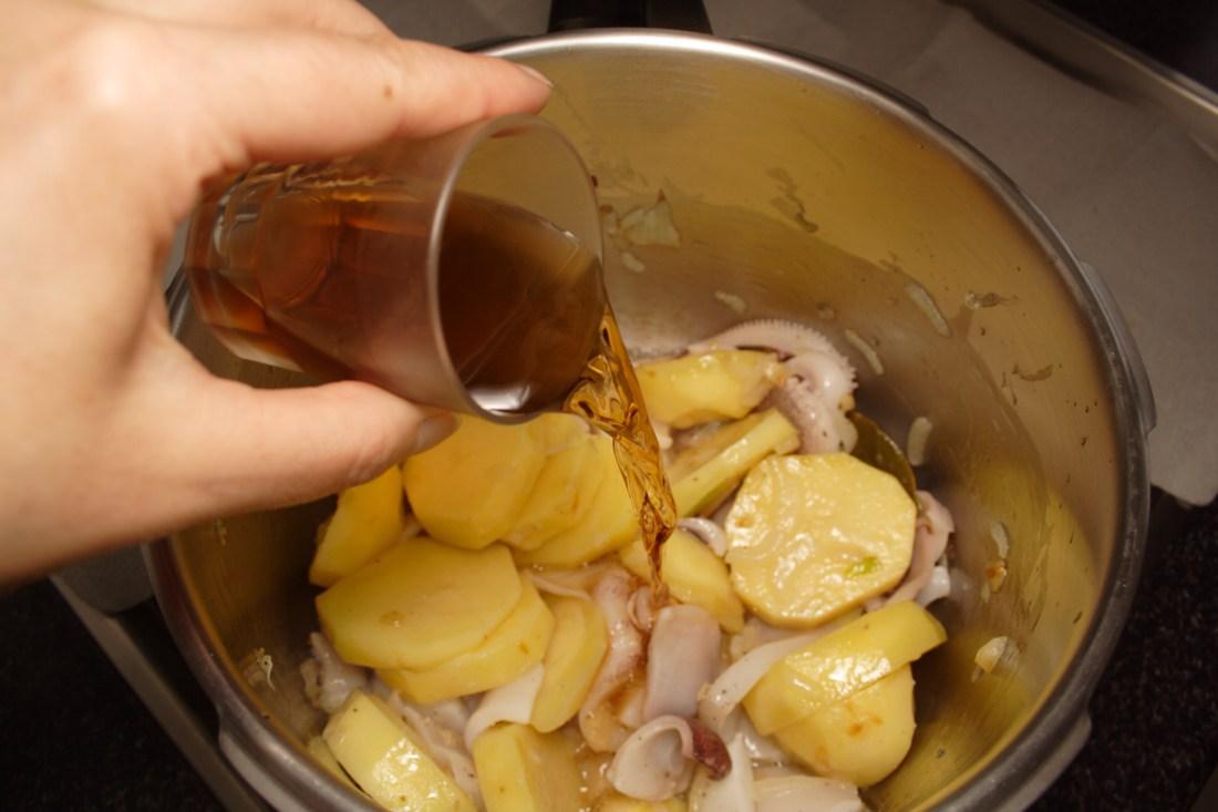 Removemos, que se evapore el alcohol, vertemos el agua, rectificamos de sal y tapamos la olla.