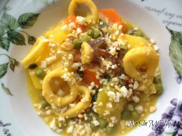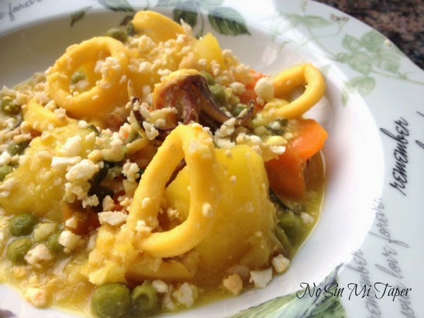 3. Añadir los calamares. Rehogar un par de minutos y añadir la zanahoria en rodajas finas y los guisantes, las patatas cascadas no muy pequeñas y el azafrán.