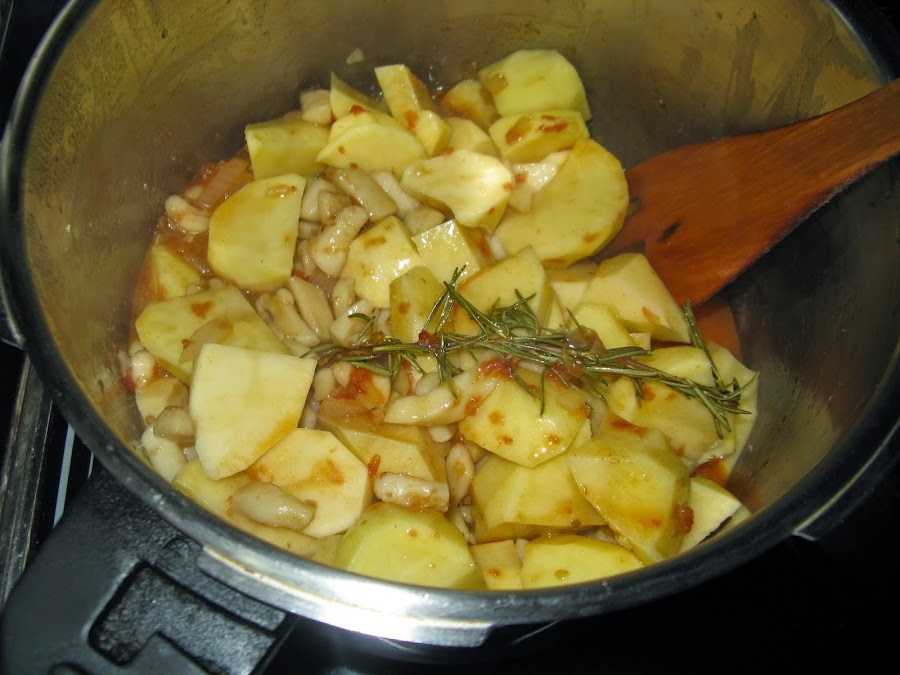 Después echamos las patatas cuarteadas "como dice mi madre" y remover todo bien y mezclarlo bien