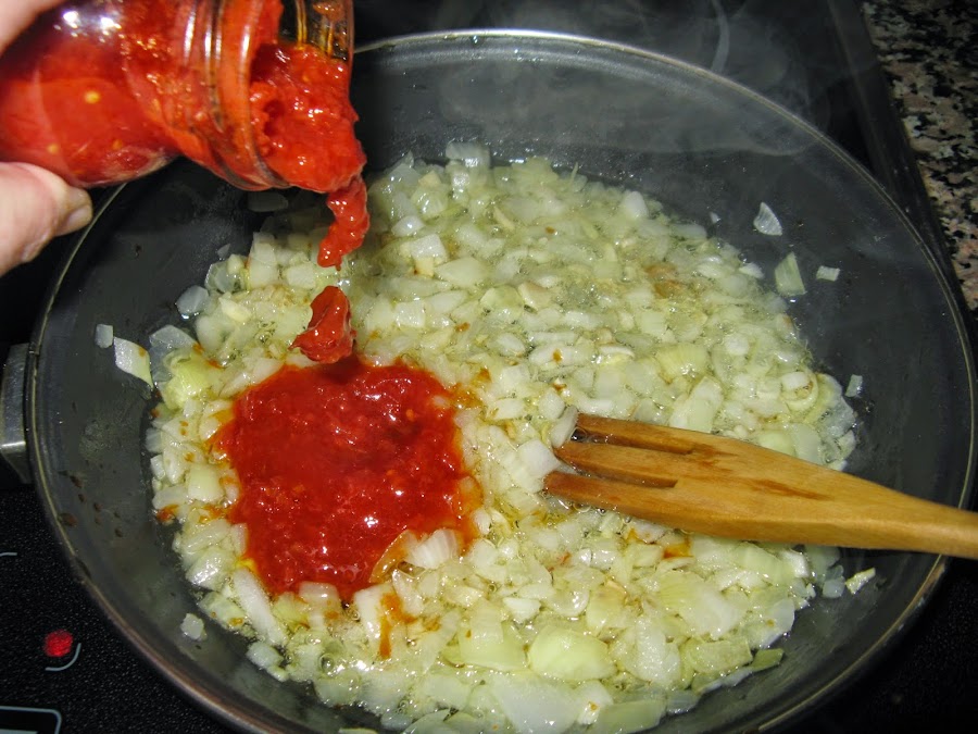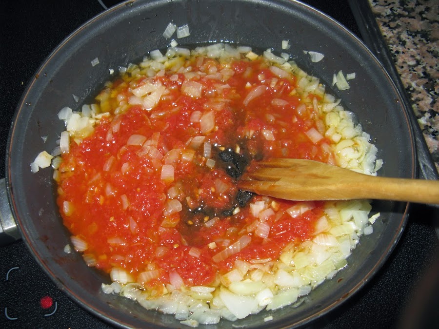 Mientras se van haciendo un poco los calamares, en una sartén ponemos aceite y pochamos un poco la cebolla junto con los ajos, cuando estén añadimos el tomate, removemos y dejamos 2 minutos hacerse un poco más
