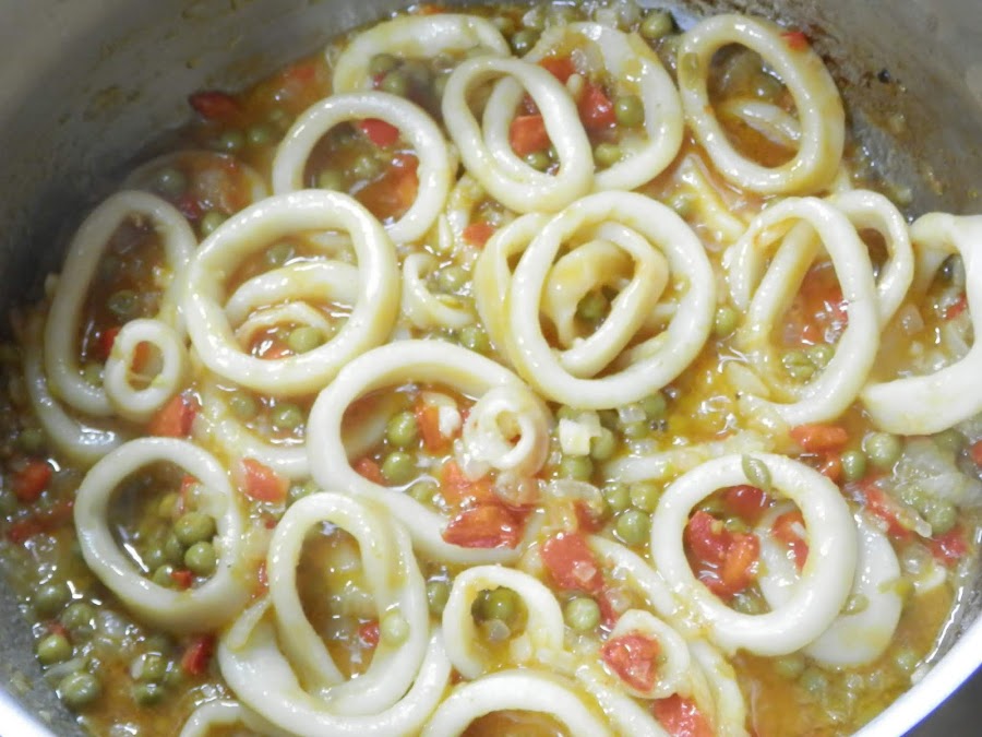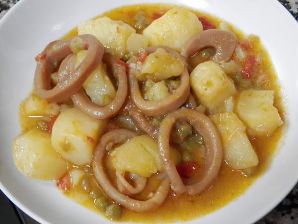 Cuando esté blandito el calamar, parte las patatas y añádelas.