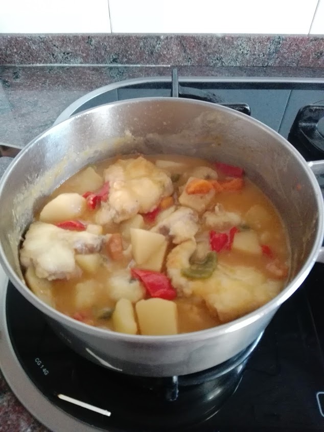 Cuando las patata tengan un punto tierno, añadir el cazón frito y dejar cocer a fuego medio- bajo hasta que las patatas estén tiernas.