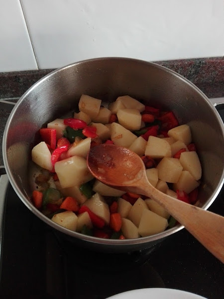 Elaboración:Una vez que se tienen las verduras lavadas y peladas. Cortar las zanahorias en rodajas, los pimientos a trozos, la cebolla muy picada.