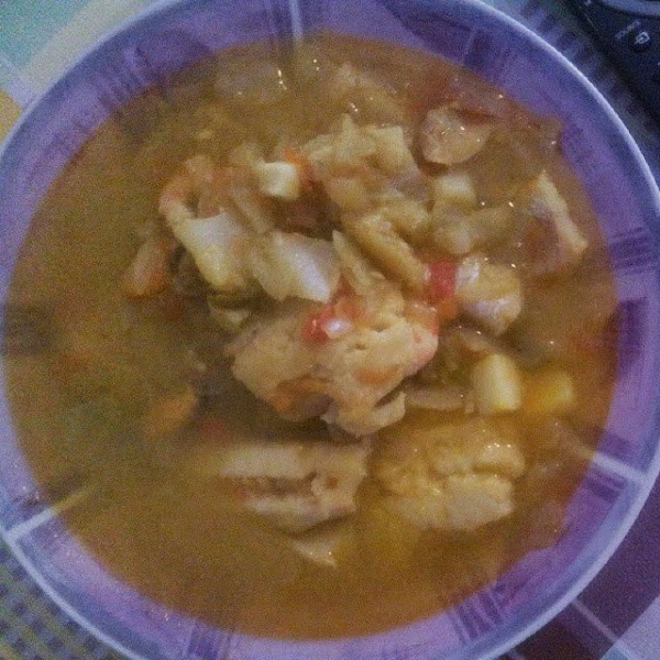 Hacemos un sofrito con el tomate, el pimiento, la cebolla y el ajo con un poco de aceite y sal. Cuando este echo, echamos el agua, la pastilla de avecrem, la col picadita y la patata entera y pelada. Se tapa con presión 20 minutos, se empieza a contar cuando empiece a girar la válvula. Pasados ese tiempo se abre, se le echa el pescado y colorante alimentario, tapamos otros 5 minutos mas. Rectificamos de sal y listo a comer.