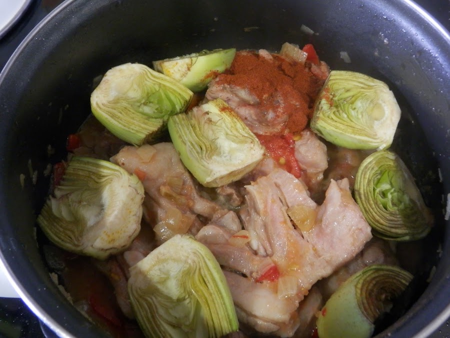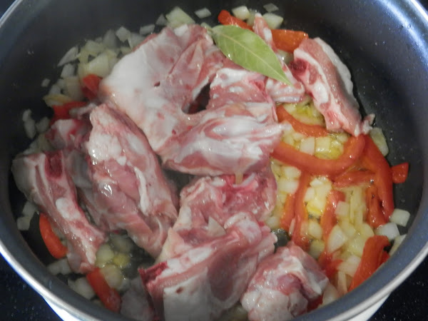 Ahora, agregamos el pimentón y el laurel. Os recomiendo que el pimentón lo pongáis fuera del fuego porque si se quema, amargará.