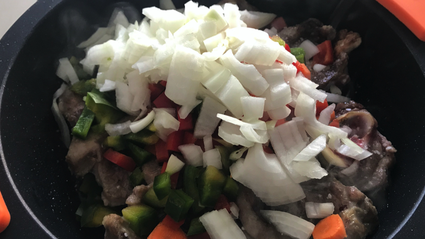 Una vez dorada la carne incorpora la verdura troceada y salteada un poco.