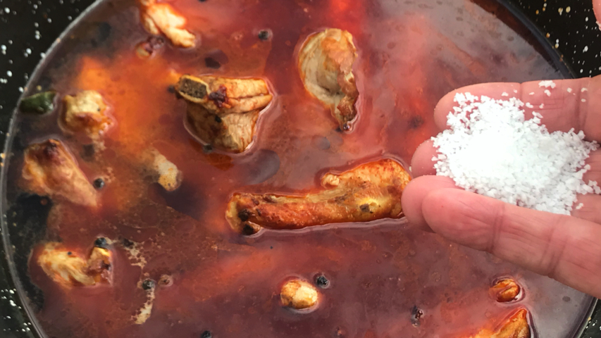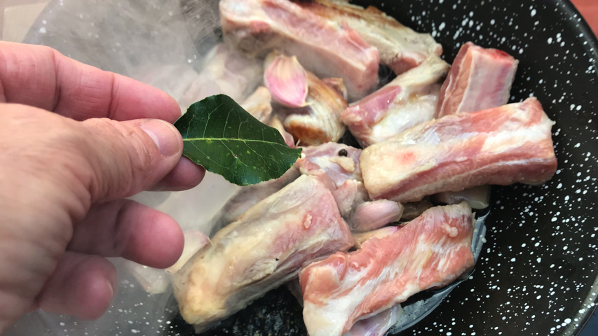 Añade las pimientas en grano, los ajos y la hoja de laurel.