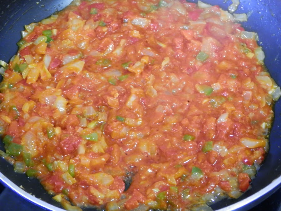 Cuando esté ya frito, añadimos el pimentón y damos unas vueltas, y al momento añadimos el tomate frito.