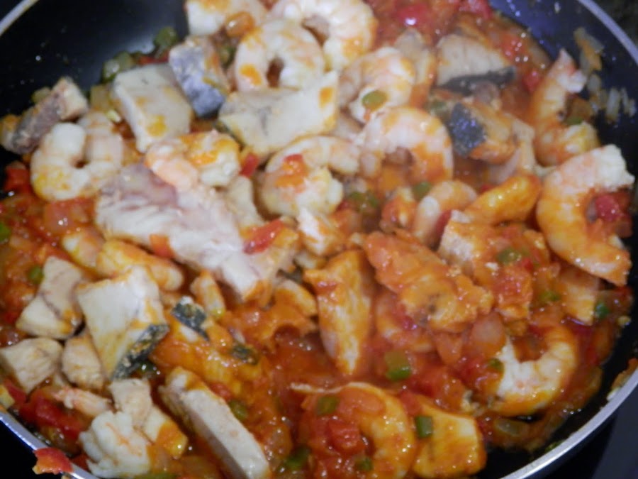 En el mismo aceite de freír el emperador, freímos la cebolla, el pimiento y el ajo.