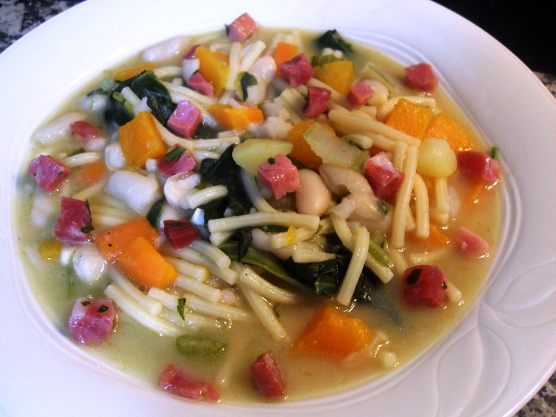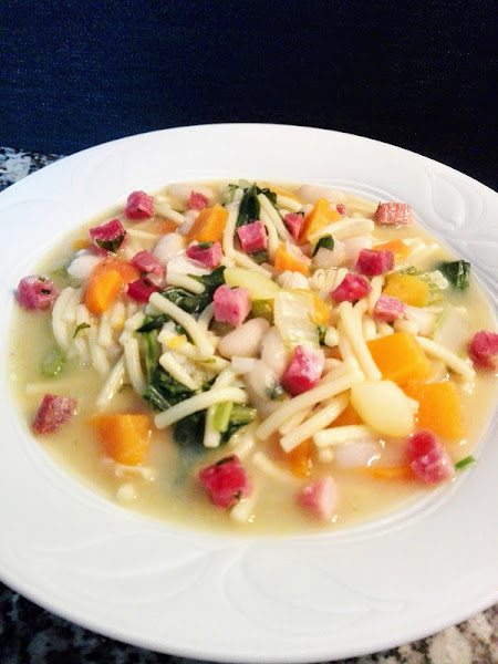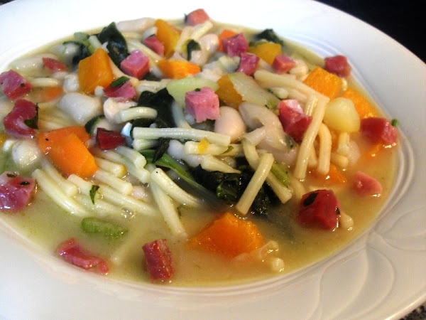 Cuando casi ya esté cocidos los fideos incorporar las judías blancas, dejar cocer unos 6 minutos más. Añadir el jamón y dejar reposar tapado un par de minutos.