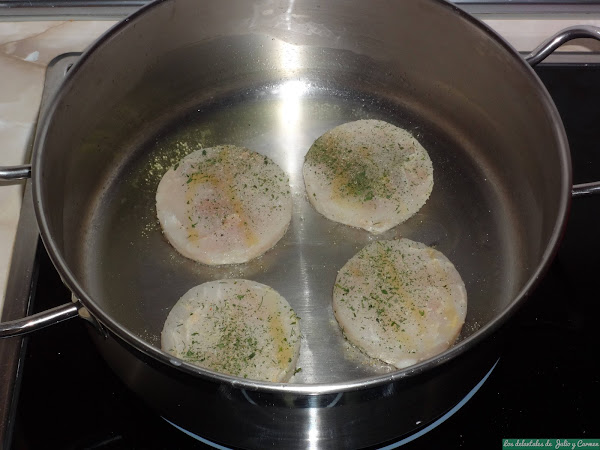 En una sarten, haremos a la plancha las rodajas de merluza, que previamente habremos espolvoreado con sal, ajo y perejil picado. Una vez las tengamos listas, las sacamos y dejamos reservadas.