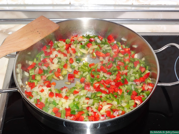 Picamos los pimientos, la cebolla y el ajo lo mas fino que podamos.