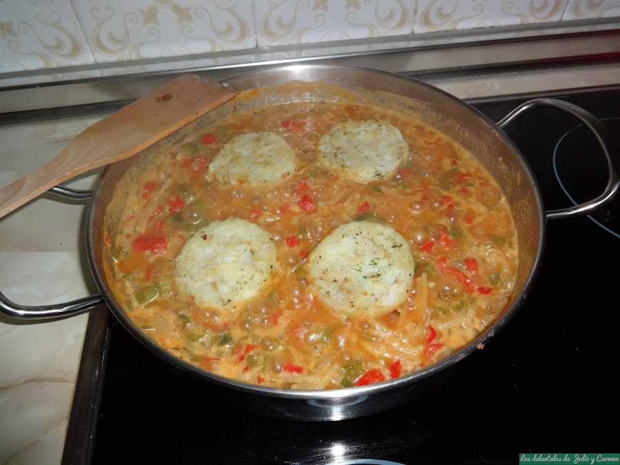 Cuando veamos (y probemos) que la pasta está casi cocida, meteremos las rodajas de merluza y las integramos con el guiso, dejando cocinar todo junto unos minutos, hasta que la pasta termine de cocerse, moviendo de vez en cuando para que no se nos pegue al fondo..