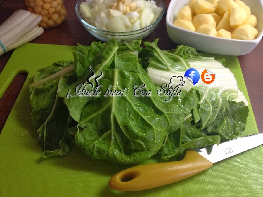 3.- Lavamos las hojas de acelgas, le quitamos la parte dura y cortamos en trozos grandes. Añadimos las hojas al guiso, cocinamos unos 5 minutos más.