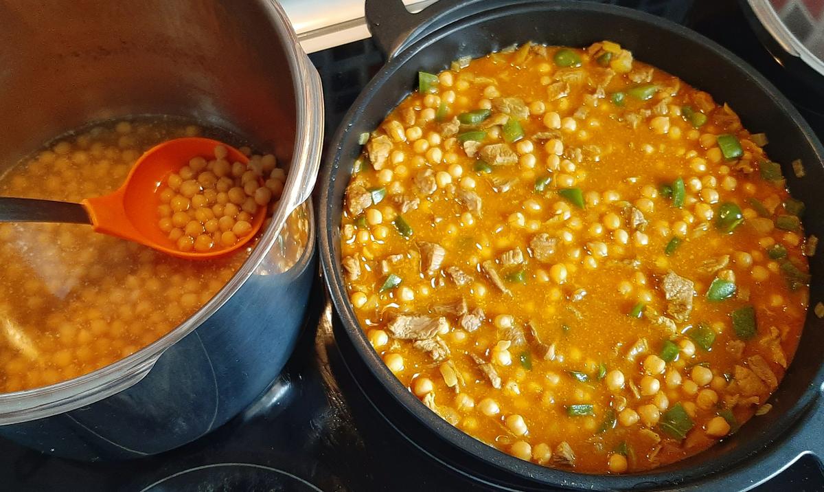 Por un lado decirte que puedes saltarte la parte de cocer los garbanzos y utilizar garbanzos de bote, para lo cual yo utilizaría 2 botes de 400g. Entonces puedes utilizar el caldo de cebolla directamente en la fase de guiso. Por otro comentarte por si no lo sabías que los garbanzos se pueden congelar remojados de manera que siempre los tengas a mano para poder cocinarlos sin tener que esperar las 12h del remojo. Yo he cocinado 500g de garbanzos en el litro y medio de caldo de mi brick pero por que sacaba comida para las niñas, sino con las cantidades aquí indicadas tienes comida para 4 personas.