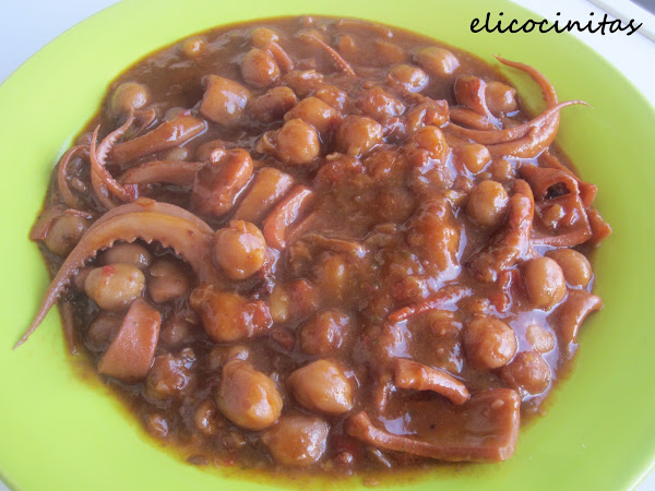 4. Cuando el sofrito esté en su punto añadimos el bote de garbanzos entero sin limpiar, es decir, con el caldo que traen. Pondremos también el caldo que habían soltado las potas y un vaso de caldo de pescado.