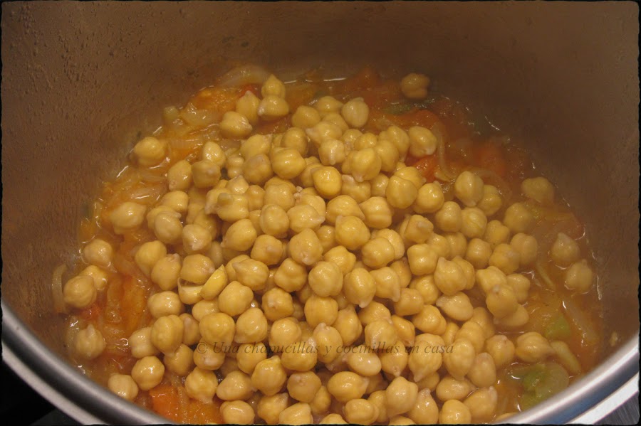 Escurrir los garbanzos del remojo y agregarlos. Cubrir con agua.