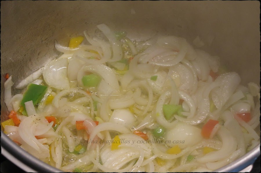 En la olla express, poner un chorrito de aceite de oliva y saltear la cebolla, el ajo y los pimientos, salpimentar.