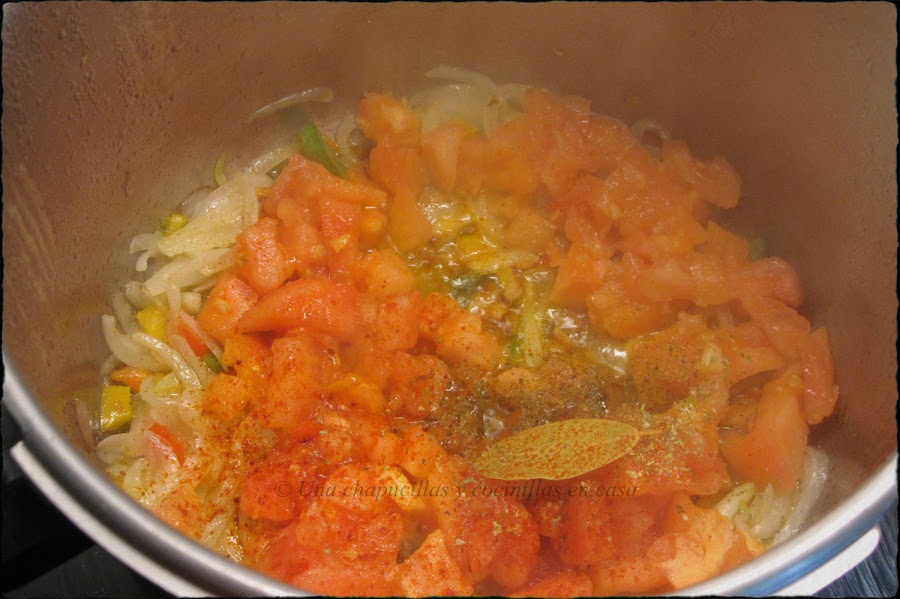 Cuando empiece a ablandar, añadir el tomate en dados y las especias, pimienta negra, pimentón dulce, el oregano y la hoja de laurel. Añadir la cucharadita de azúcar para reducir la acidez del tomate. Remover bien todo, bajar el fuego y tenerlo a fuego lento borboteando durante 5 minutos.